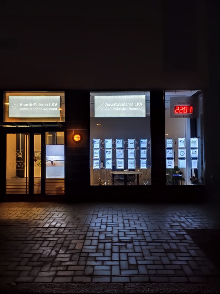 Yritysilmeen muutos. Pinkokehystauluja, valotauluja, lämpömittarikello, info-tv ja teippaukset, Toteutimme asuntosataman ilmeenmuutoksen toiveiden mukaisesti ja muokkasimme julkisivusta hyvin valaistun ja silmään pistävän kokonaisuuden. Asensimme yrityksen logoa kantavat pinkokangastaulut ja lämpömittarikellon ikkunoiden yläosaan. Poistimme vanhat ikkunateipit ja asensimme valotaulut, jotta myytävänä olevat asunnot ponnahtavat selkeästi esiin ja niitä on helppo katsella iltakävelylläkin. Lisäksi teippasimme logon ja aukioloajat etuoveen ja asensimme info-TV:n, jonka kautta yritys voi viestiä vaihtuvaa mediaa kuvamuodossa.